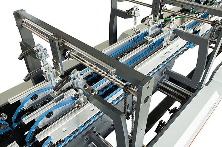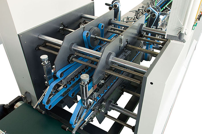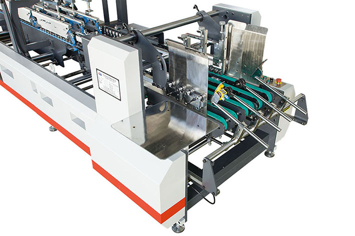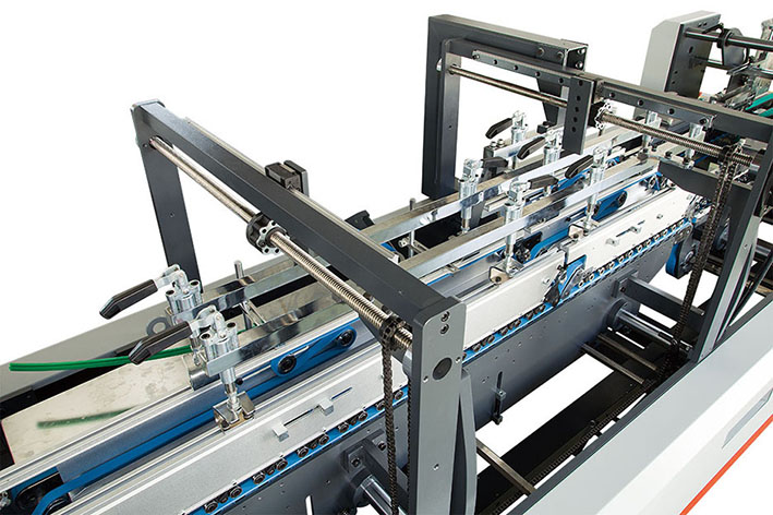 特殊設(shè)計本折部左右輸送折帶速度可單調(diào)節(jié),以校正盒坯行走方向,確保直線輸送。